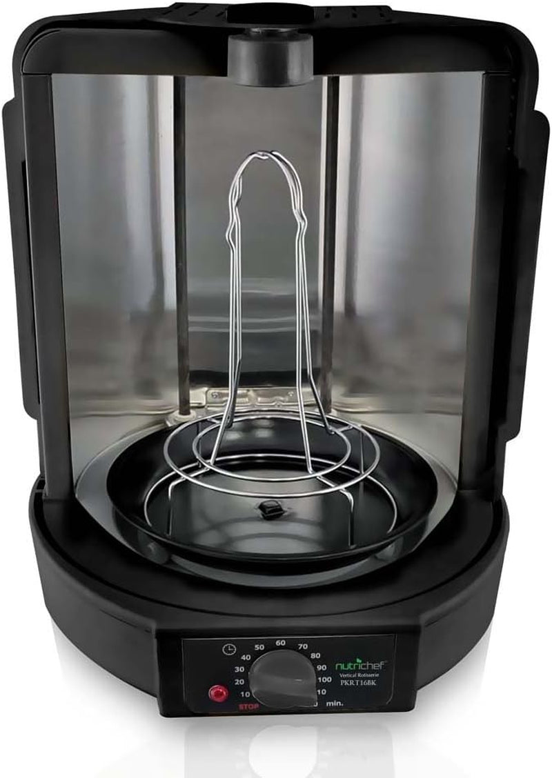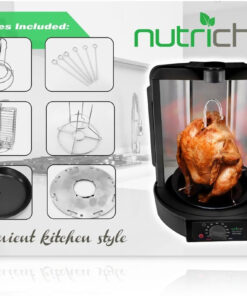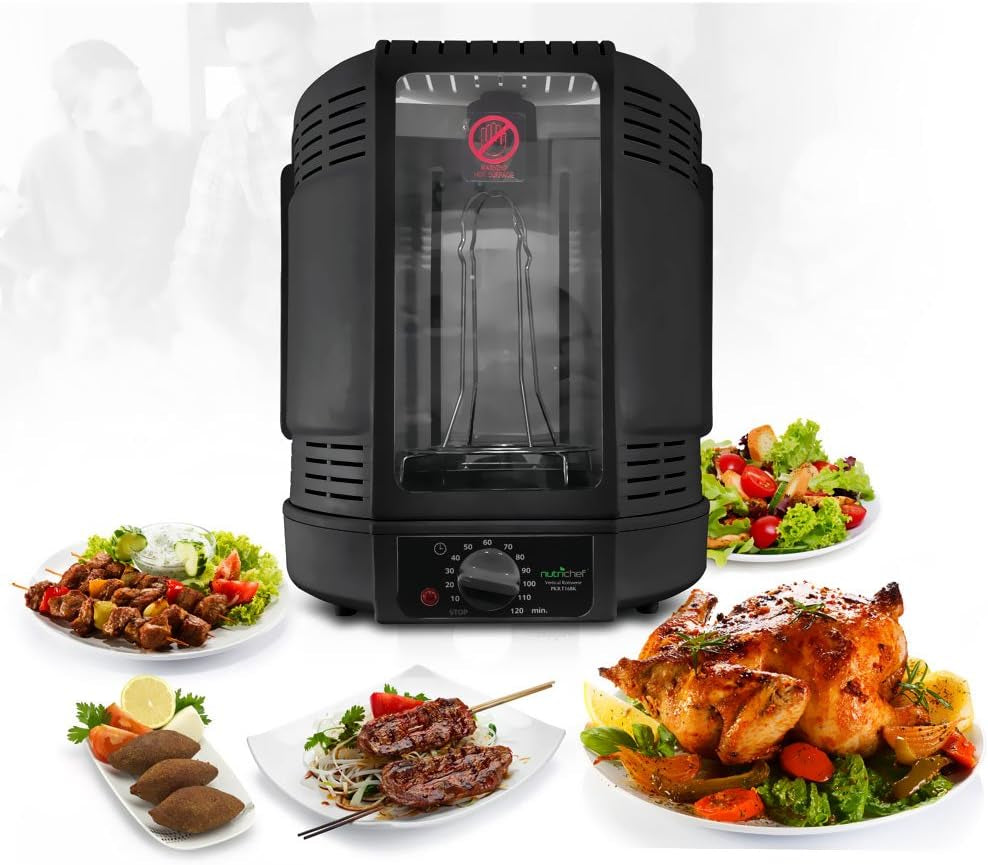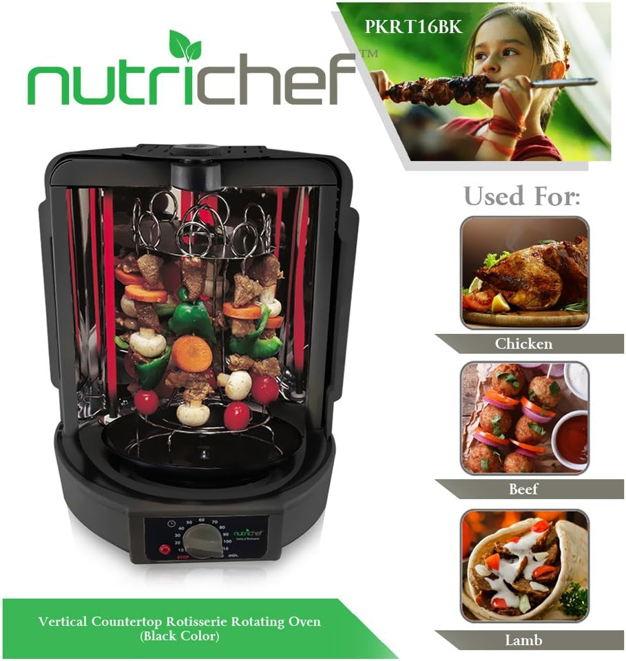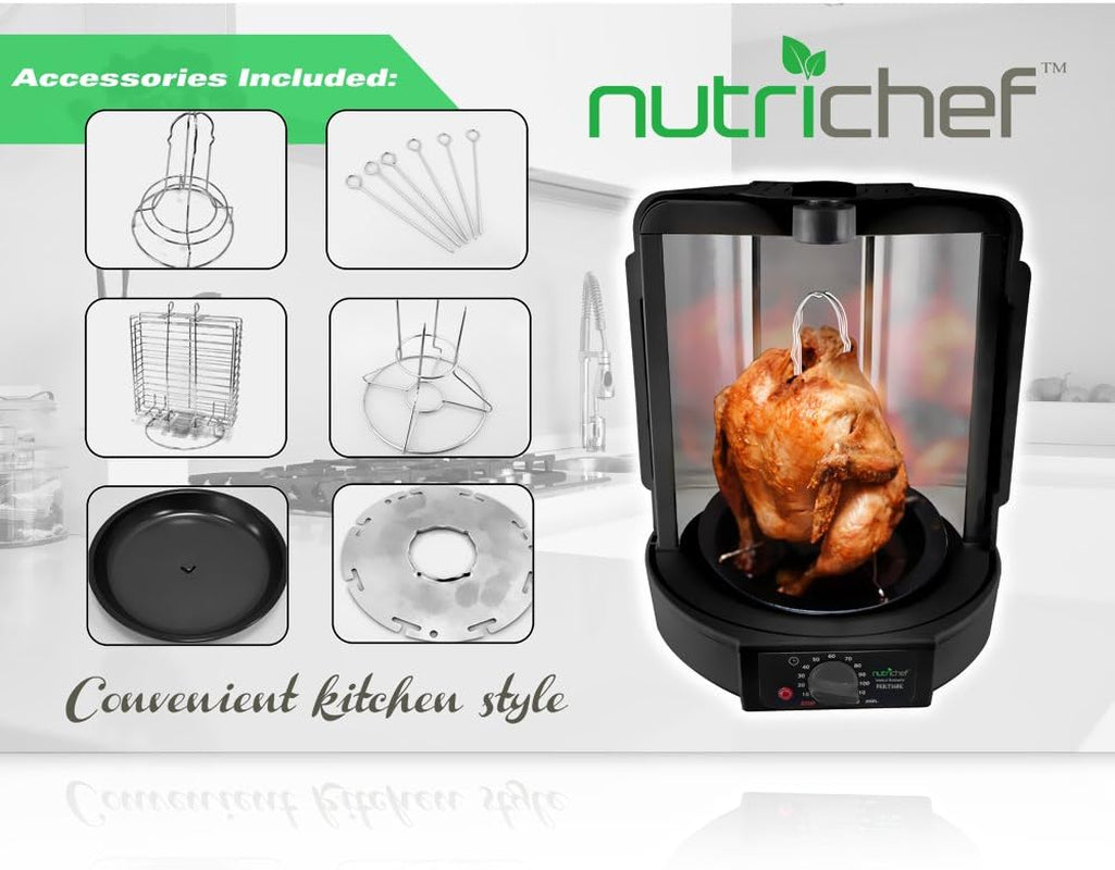 - HEALTHY COOKING: Welcome to the world of easy and healthy eating with our NutriChef Vertical Rotisserie. Gravity reduces the fat from the food placed inside as excess food fat drains into the drip tray below
