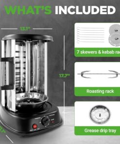 - ALL-INCLUSIVE ACCESSORIES: Enhance your cooking experience with the included kebob rack featuring seven skewers and a grease drip tray. Enjoy mess-free cooking and explore endless recipe possibilities.