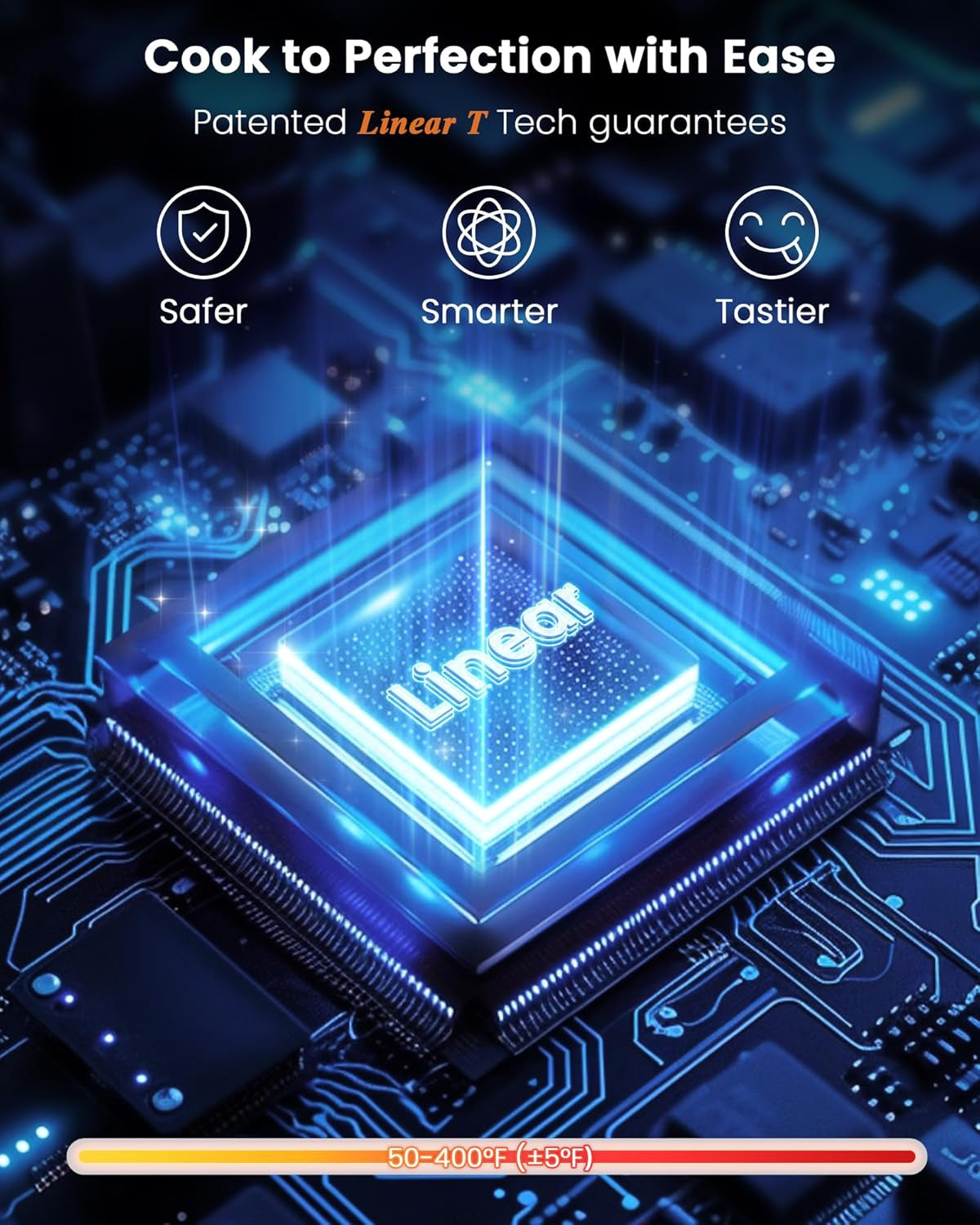 - AUTO SHUTOFF & LINEAR T TECHNOLOGY: Precisely adjust cooking temps from 50°F to 400°F anytime. with auto-shutoff for safety. Patented Linear Tech guarantees perfect results by monitoring and adjusting power. every dish is cooked to perfection every time.