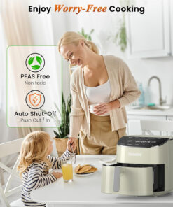 Nuwave Brio plus Air Fryer 8 Qt. New & Improved. PFAS-FREE. 7 Digital One-Touch Cook Functions That AIR FRY. BAKE. ROAST. DEHYDRATE. TOAST. REHEAT. PREHEAT. 150 Presets. 50°F~400°F (Cream)