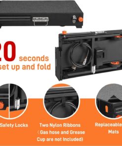 - Foldable Design – This Grill Cart is came in fully assmebled. Portable Outdoor Grill Table folded just as compact as a suitcase for mobility but it can be set up quick and easily in just a few steps. Simply unfold the legs frame. set the bottom shelf onto the frame then it’s ready to use. Folds up nicely for storage too. Perfect for tailgating. camping and RV.