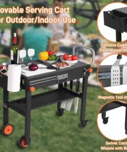 - Oversize Table Top Surface. Condiments Bin and Bottom Shelf -An additional preparing space. storage shelf is always a plus to enhance your outdoor cooking experience. Flat Top/Grill/Griddles Stand can also become an outdoor prep station. set your favourite ingredient and seasoning into the Bin. Preparing your meal on the table surface and set the plates. tableware. napkins and so on. Everything is so organized.