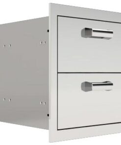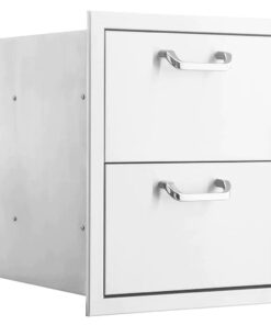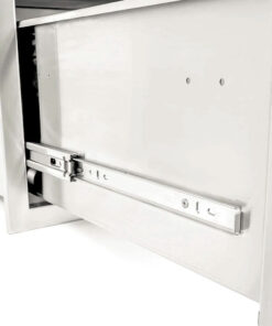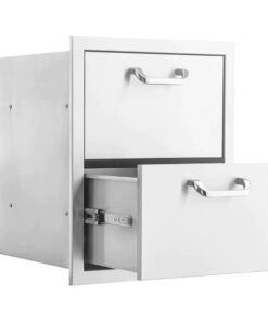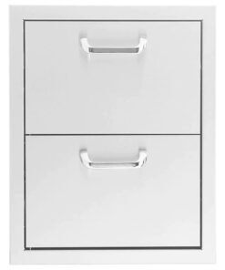 This PCM 16-Inch stainless steel double access drawer is constructed with a 20 gauge 304 stainless steel frame and number 4 brushed finish. Unit is flush mounted. and the drawers use heavy-duty. commercial grade ball bearing drawer glides on full length drawer tracks for easy opening and closing. An access drawer is the perfect outdoor kitchen accessory for any outdoor BBQ island. adding storage space for your tools and spices.