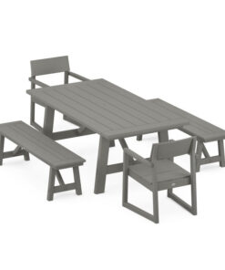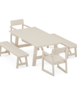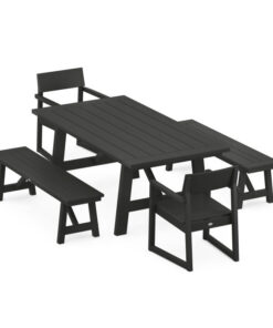 The EDGE Collection merges minimalism with sustainable design. creating all-weather furniture that leaves a lasting impression. With options sized just right for any layout. our modern outdoor dining collection seats everyone comfortably. whether you’re hosting dinner on a spacious patio or an intimate balcony. The sleek EDGE 5-Piece Rustic Farmhouse Dining Set With Benches includes one rectangle table and mixed seating styles.