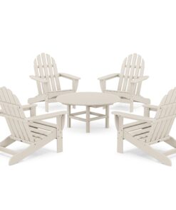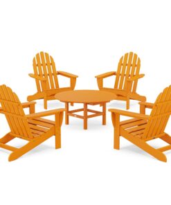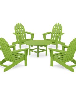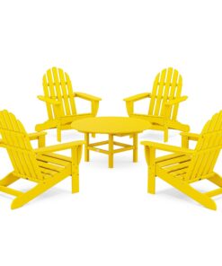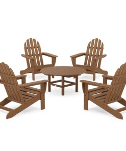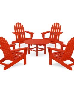 The Classic Adirondack 5-Piece Conversation Set lets you stretch out and relax. which is perfect for chats on the patio with friends. or for watching movies on your outdoor theater in your backyard. The Adirondacks provide the perfect recline for you while the conversation table gives you a surface to share snacks or drinks.