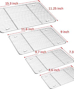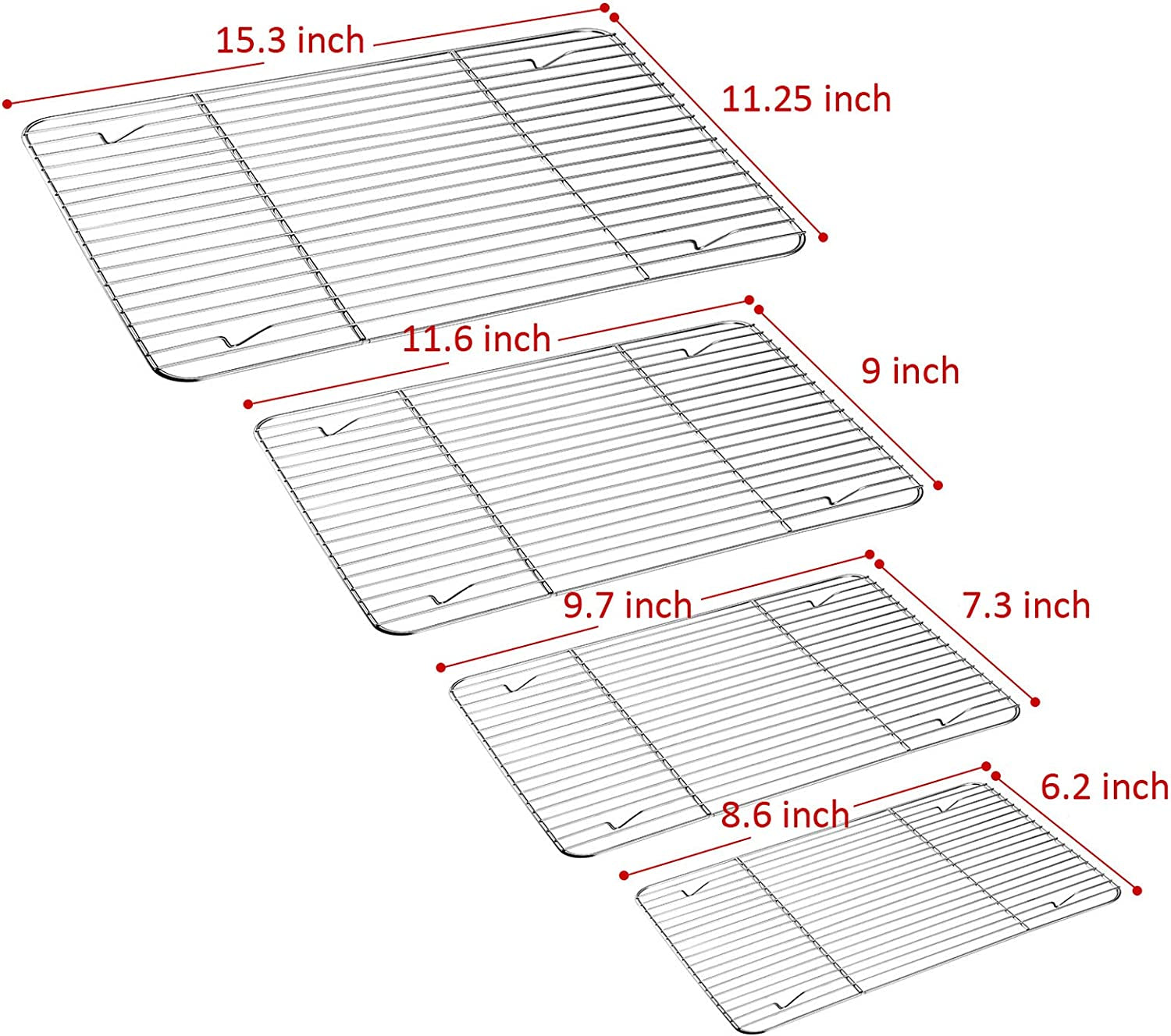 - 【VERSATILE】4 Sizes. Large 15.3 x 11.25. Medium 11.6 x 9. Small 9.7 x 7.3. Smallest 8.6 x 6.2. Fit your baking sheets of different size.Sufficient for baking cookie. roasting chicken wings. grilling meats. cooling food. filtering oil