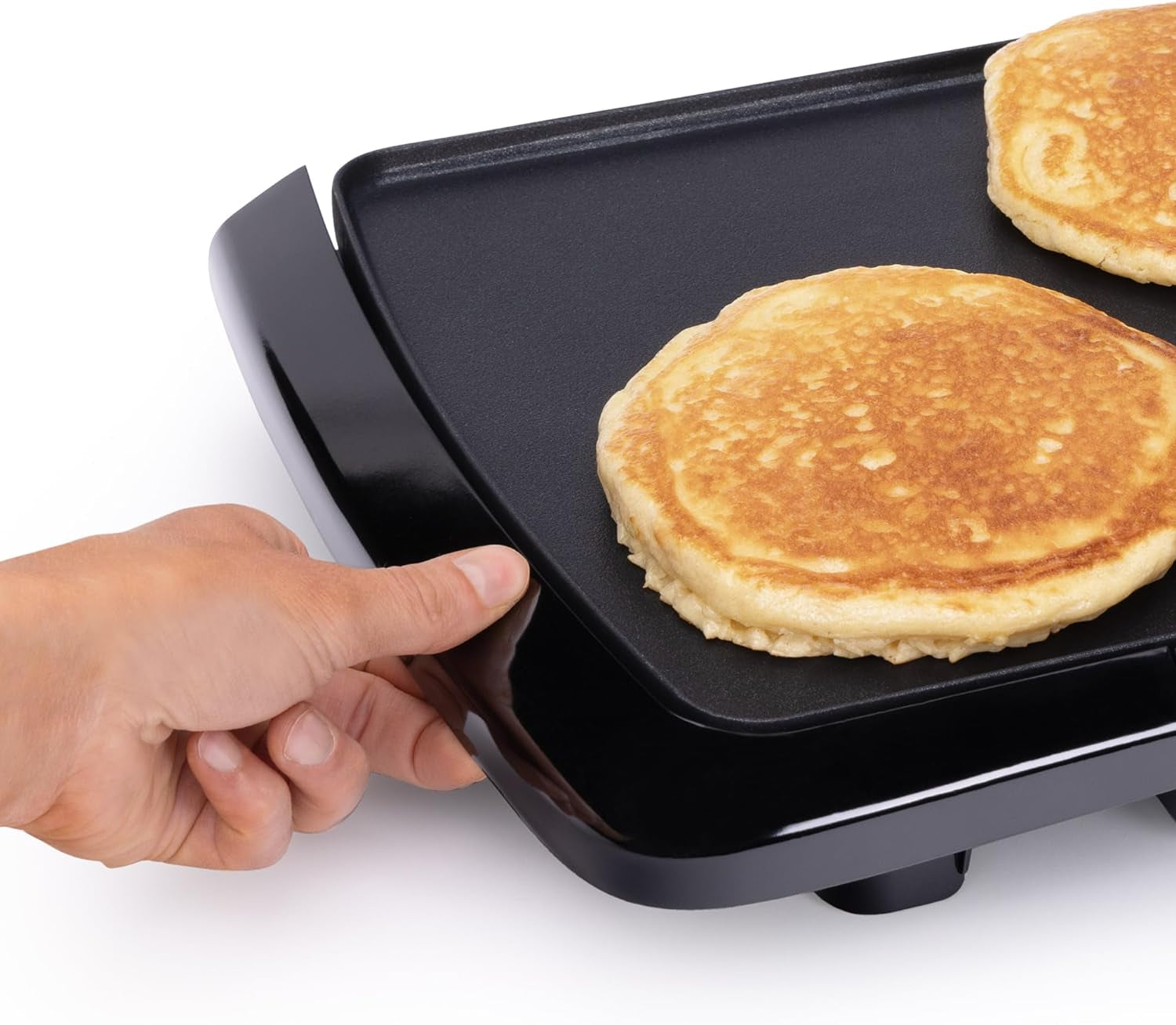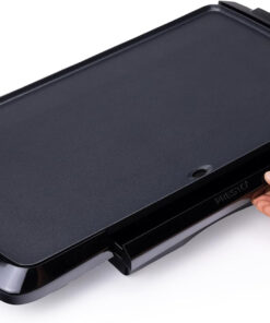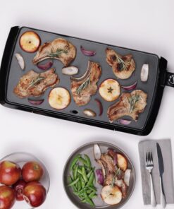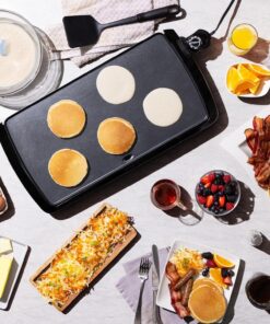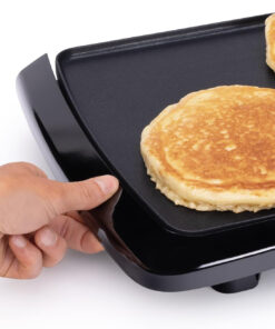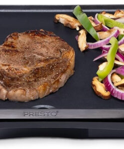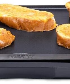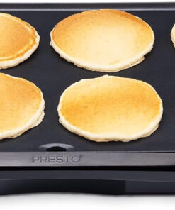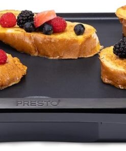 Cook breakfast. lunch. and dinner on the Presto® cool-touch Electric Griddle. It features a large 10 1/2- x 20-inch PFAS-free ceramic nonstick cooking surface that assures stick-free cooking and easy cleaning. With the convenience of a cool-touch base. low-profile styling. and a backstop ledge. this griddle is ideal for serving family-sized meals and for using as a buffet server when entertaining. The adjustable Control Master® heat control maintains cooking temperatures automatically. When cooking is finished. remove the drip tray for easy cleaning. The griddle is fully immersible with the heat control detached.