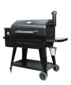 The Pit Boss® Pro Series 1600 Wood Pellet Grill also includes deluxe features such as a 32 lb. hopper capacity with a viewing window and an easy cleanout door. crosshatch porcelain coated cast iron cooking grates for perfect sear marks. an interchangeable griddle insert for a flatiron cooking option. a folding front shelf. a solid bottom shelf and solid side shelf with built-in tool rack and the Pit Boss® best-in-class 5-year warranty.