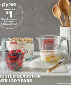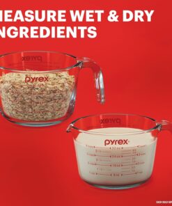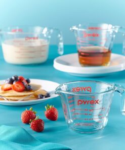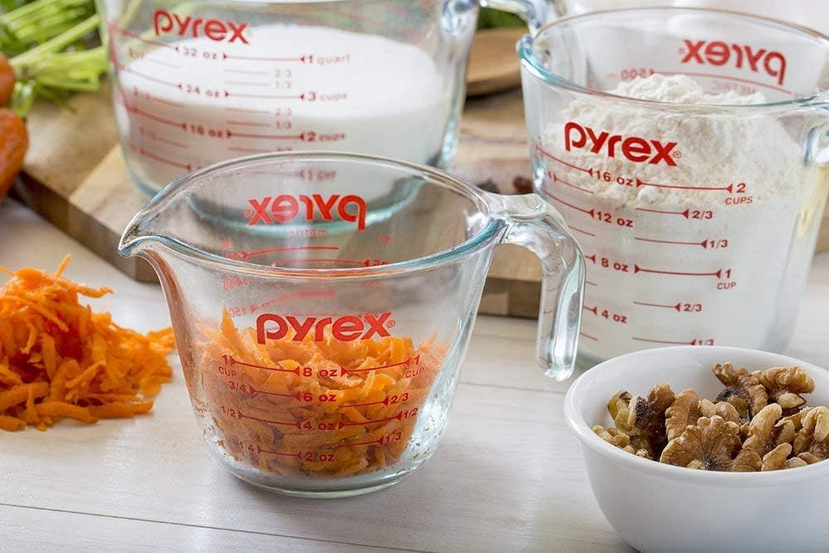This handy trio of measuring cups ensures you’ll always have the right size on hand. Each has easy-to-read measurement markings in red for at-a-glance precision. easy-grip handles. and spouts designed for controlled pouring. And because they’re made of durable Pyrex glass. you can melt ingredients like butter or chocolate right in the cup – and then pop it in the dishwasher for easy cleanup. This set includes: (1) 1-cup Measuring Cup. (1) 2-cup Measuring Cup and (1) 4-cup Measuring Cup.