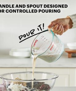 - EASY GRIP HANDLES: Adding milk to your cake batter. We got you covered. All Pyrex measuring cups feature a curved spout for non-mess pouring and easy-grip handles for comfort.