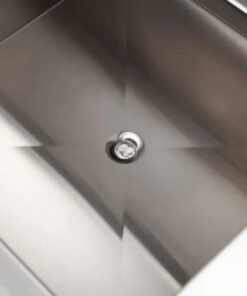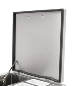 Constructed with pride in the USA. this cooler features durable 18 gauge. 304-stainless steel construction. ensuring longevity and reliability. It is equipped with a heavy-duty stainless steel handle and hinged lid for easy access to the contents.