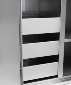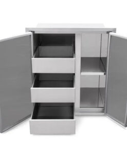 An ideal solution for dry outdoor kitchen storage. With 3 sliding drawers & 2 shelf areas. Quivira Water Resistant 30×31 Dry High-Pantry Storage provides ample space for pantry items. utensils. cleaning materials. and more. ensuring easy access and organization in your outdoor cooking space. The tightly sealed doors protect food items from the elements. dust. and critters. maintaining their freshness and quality.