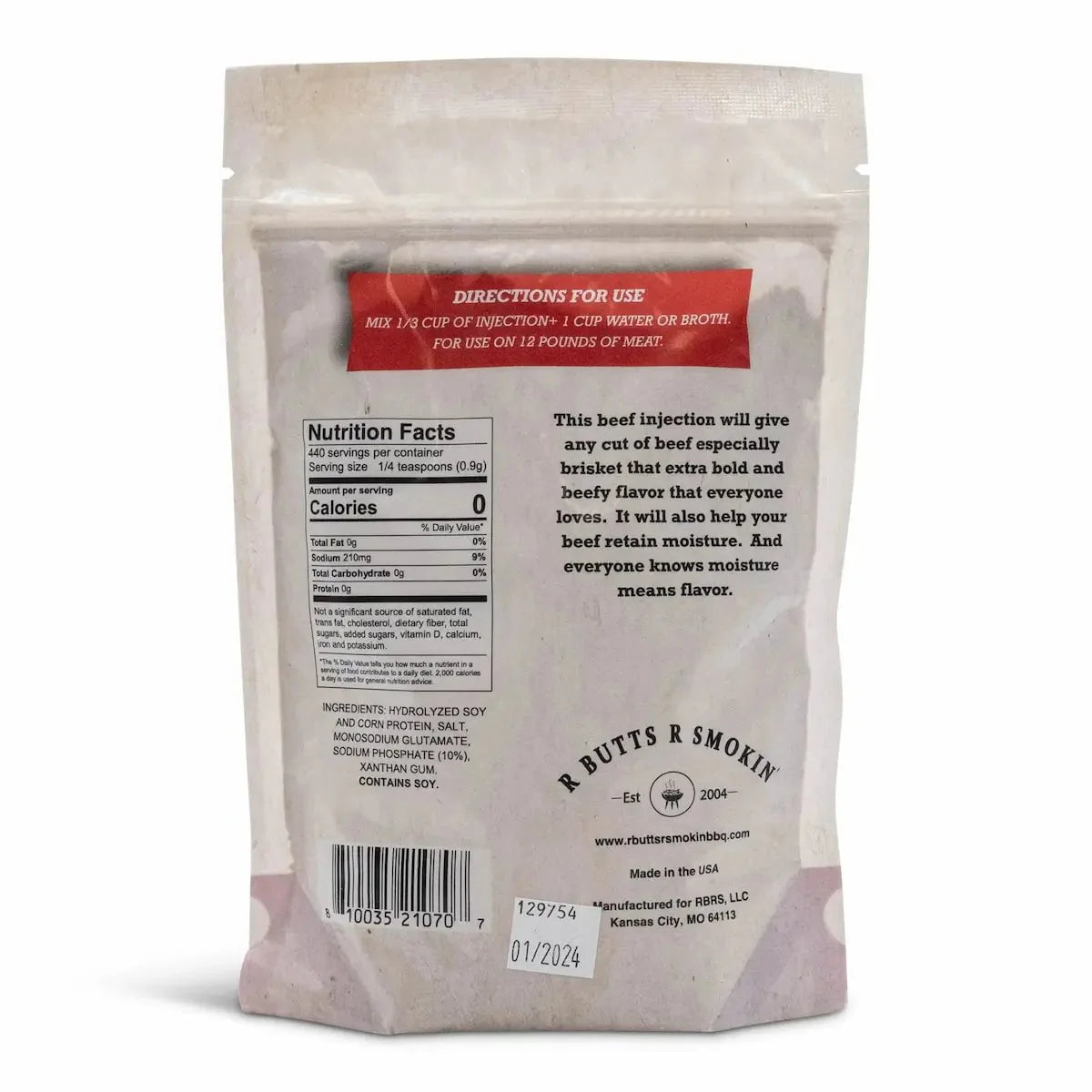 Crafted to perfection. R Butts R Smokin’ Double B Beef Injection is meticulously formulated to infuse your beef with unparalleled flavor and moisture. Simply mix it with water or broth to create a potent marinade. then inject it into your beef for an explosion of savory goodness in every bite.