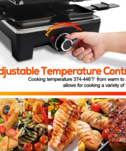 - Adjustable Heating Control-Thanks to the adjustable heating control & the indicator light. this indoor table grill Suitable for roasting all kinds of meat. seafood. vegetables or eggs. crepes and pancakes. Just finish your whole day meals in one machine. Heats up in advance for the better results.