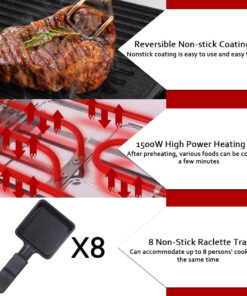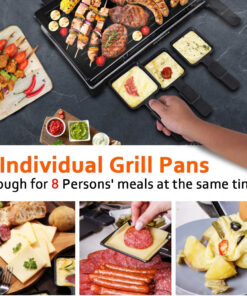 - 8 Independent Raclette Trays-Equipped with 8 heat-resistant Raclette trays. this cheese raclette can prepare cheese dishes for 8 persons’ at the same time. It can be used to make raclette cheese. desserts and more food. or to keep food warm. Non-stick coating makes it easier to handle food removal and cleaning.
