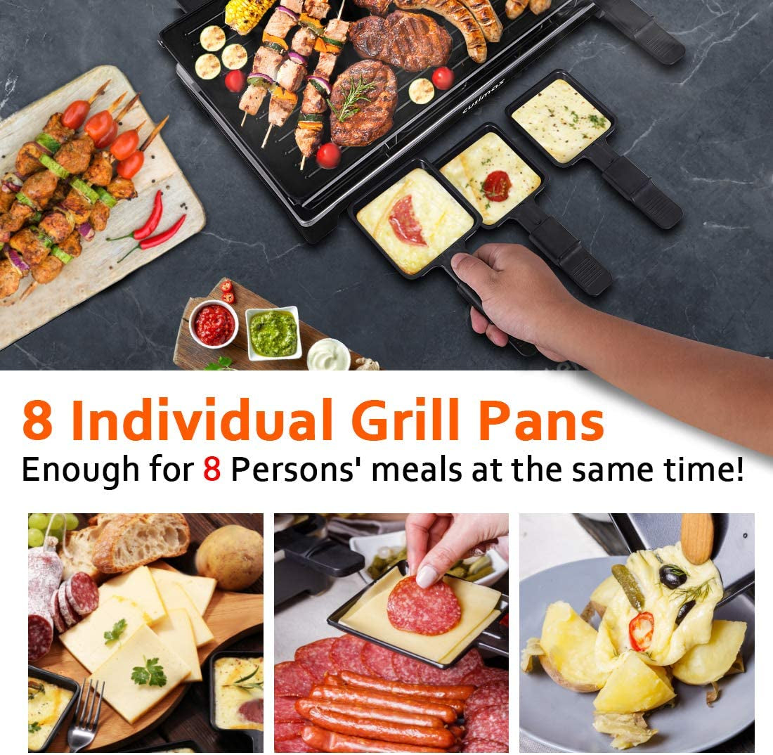 - High Power & Non-Stick Grill-CUSIMAX 1500W electric raclette grill. ideal for parties and family dinners. With reversible non-stick baking tray. the grooved surface can be grilled with grill marks and easily remove excess oil. The flat surface is suitable for making crepes. pancakes and eggs for breakfast. 2 in 1 grill saves your trouble to pull out another equipment!