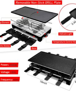 - Portable & Easy to Clean-The reversible baking tray and 8 Raclette trays can be easily removed. The non-stick coating can easily help you remove food and clean it easily. The 19 x 9 inch size can be easily stored and moved. Your portable social restaurant!