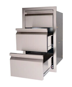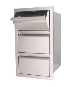 The RCS Valiant Series Double Access Drawer and Paper Towel Holder Combo is constructed with durable 304 stainless steel. ensuring its resilience against outdoor elements. The fully enclosed design allows you to store grilling and cooking accessories without exposure to the outdoor elements. The tilt-out paper towel dispenser at the top keeps your paper towels dry for the next use. The soft-close drawers close smoothly and quietly. and their full-length tracks and double-lined doors provide sturdiness. The recessed handles give the drawers a sleek look that complements any outdoor kitchen or BBQ island.
