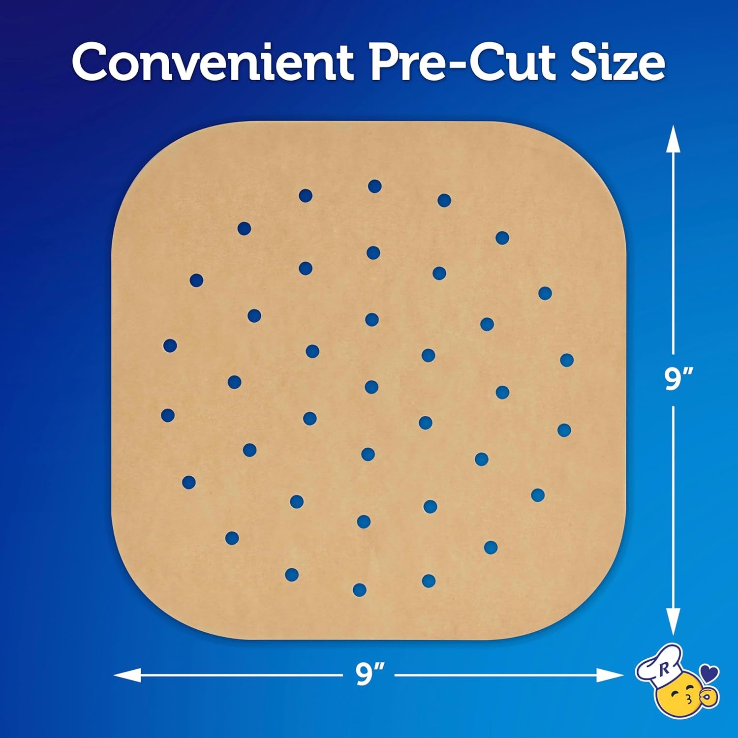 - REYNOLDS AIR FRYER LINERS: Contains one pack of 50 pre-cut Reynolds Kitchens Air Fryer Liners. each liner measuring 9 inches by 9 inches