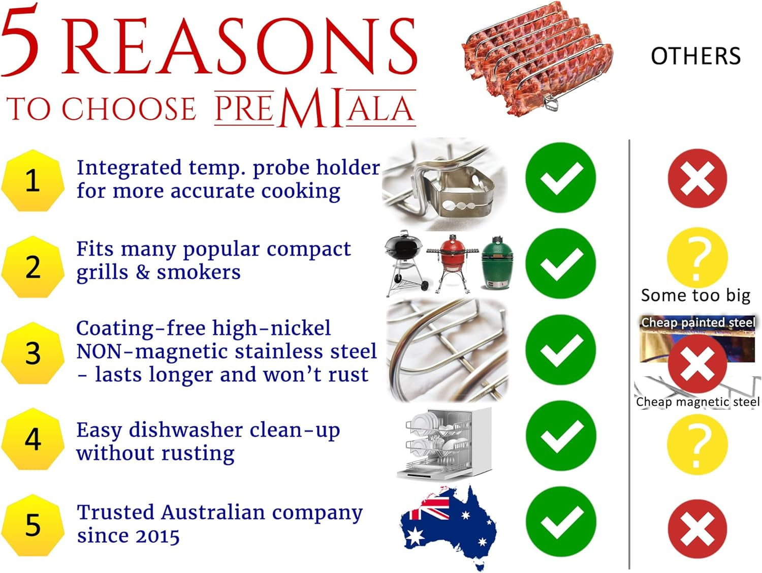 - 👍NO CHEAPIE ‘NON-STICK’ COATING! Don’t be fooled by ‘non-stick’ rib racks – they’re just cheap mild steel with a dodgy paint job that flakes off onto your food! And cooked marinade still sticks to a ‘non-stick’ coating anyway (we tested it!). Unlike look-alike products made from cheap stainless steel. the Premiala Rib Smoker Rack uses premium high-nickel. NON-MAGNETIC stainless steel. so it’s GUARANTEED to leave NO residues or chemicals on your food. and NO DODGY COATINGS to taint your food.