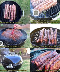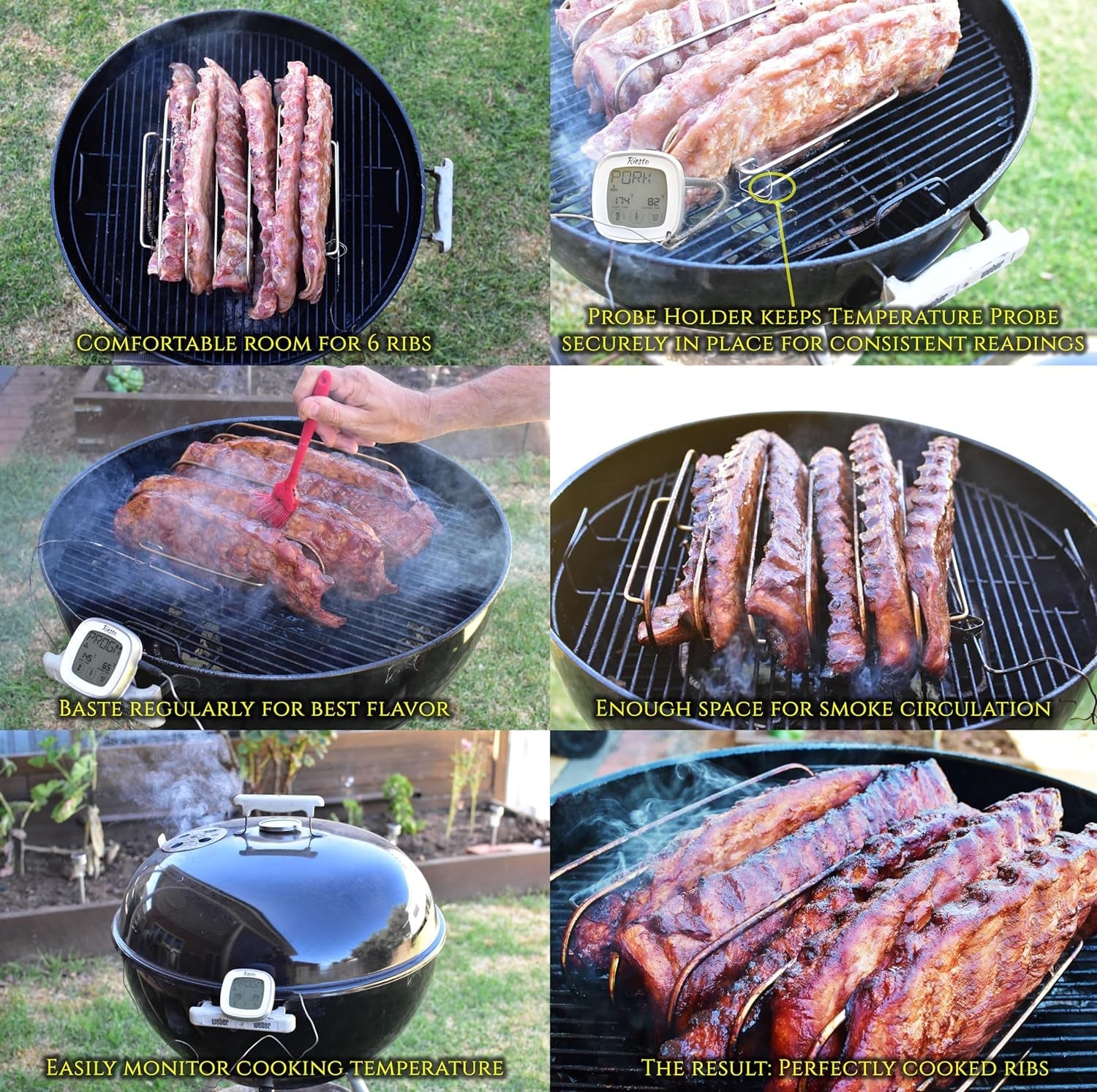 - 🌡NEVER OVERCOOK RIBS AGAIN WITH INTEGRATED TEMPERATURE PROBE HOLDER! Lots of folks use a digital thermometer to check exactly when the ribs are done. but it’s impossible to keep the probe exactly where you want it. Don’t waste time or precious heat trying to poke the probe between the grates. only for it to fall out every time you open the lid – the Premiala BBQ Rib Rack includes a three-size thermocouple probe holder so you can painlessly monitor temperatures inside your smoker or grill!