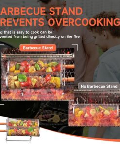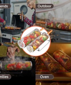 Rolling Grill Basket for Outdoor Grill 2 PCS. BBQ Grilling Gifts for Men Dad Husband. Stainless Steel Grill Mesh Barbeque Grill Accessories. Grilling Net with Wooden Handle & Stands. Outdoor Camping Tools for Chicken. Meat. Fish. Steak. Vegetables. Seafoo