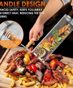 - [Wood Handle] The rolling grilling basket with wood handle can better control for precise adjustment and turning of food. Easy to flip. shake. or move the grill baskets to ensure even cooking. The handle keeps from direct heat and reduce the risk of burns. enhance the security. Also. it enhances grip for easy control the grilling.