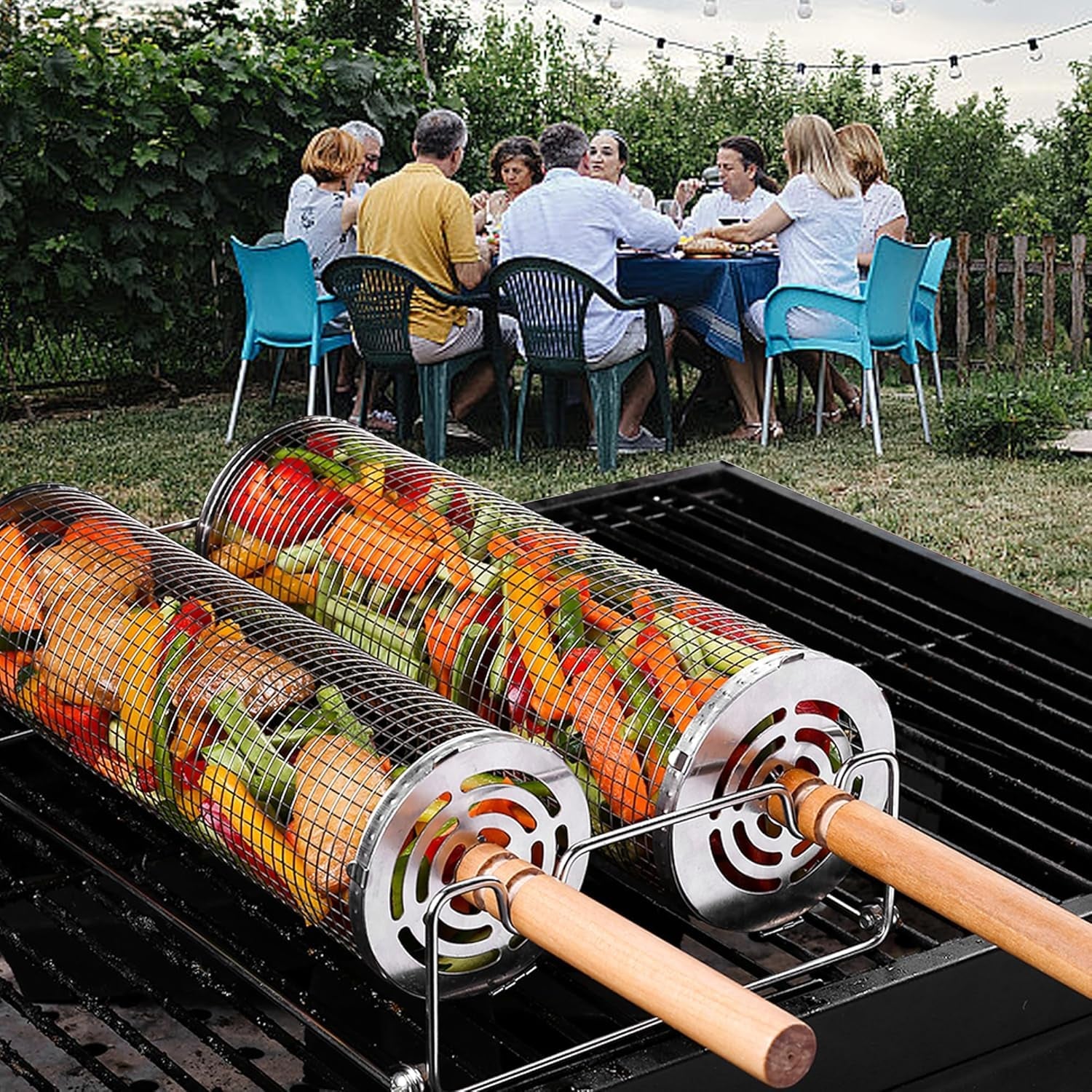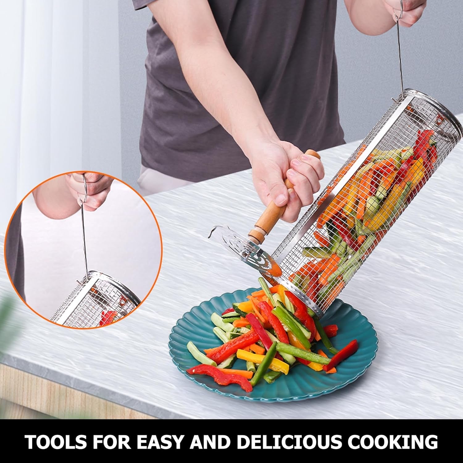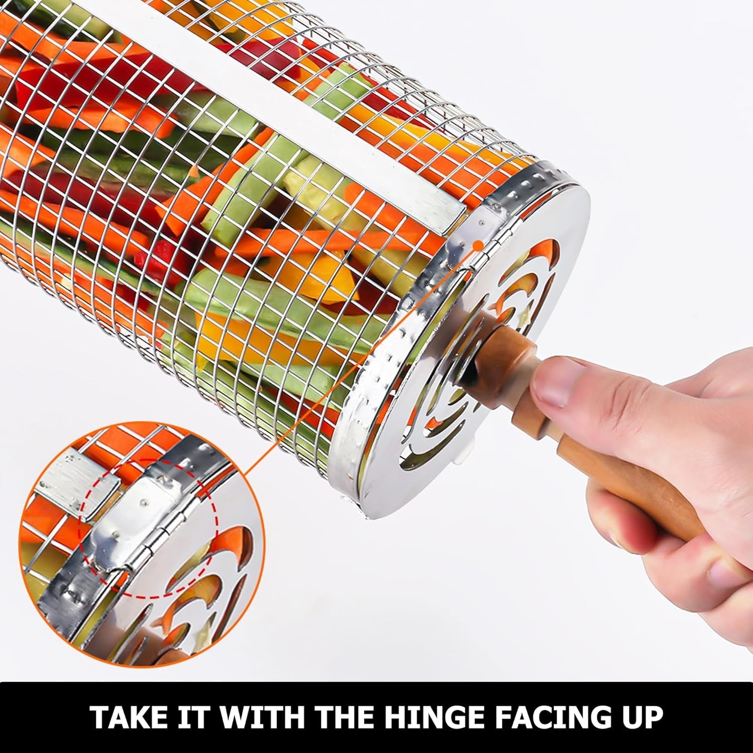 Rolling Grilling Baskets for Outdoor Grill Bbq Stainless Steel Holder Barbecue Cylinder Cage Cooking Accessories for Veggies Vegetable Camping. Birthday Gift for Men Dad Husband Him Fathers Day Papa