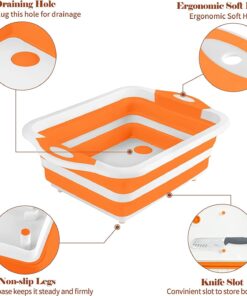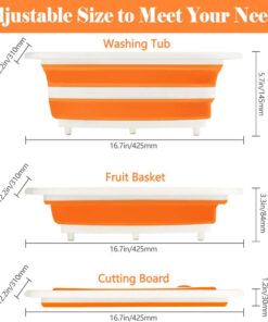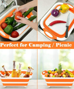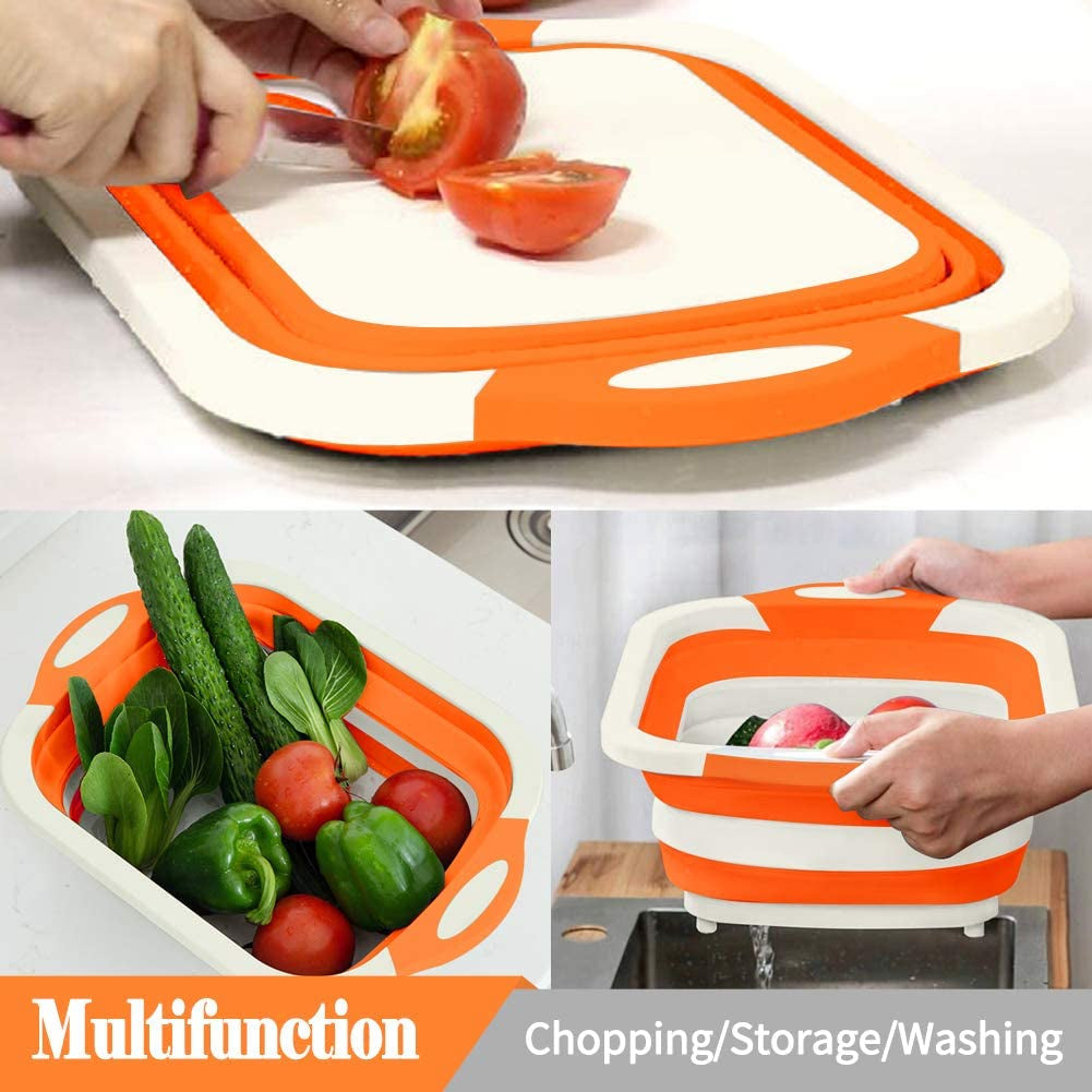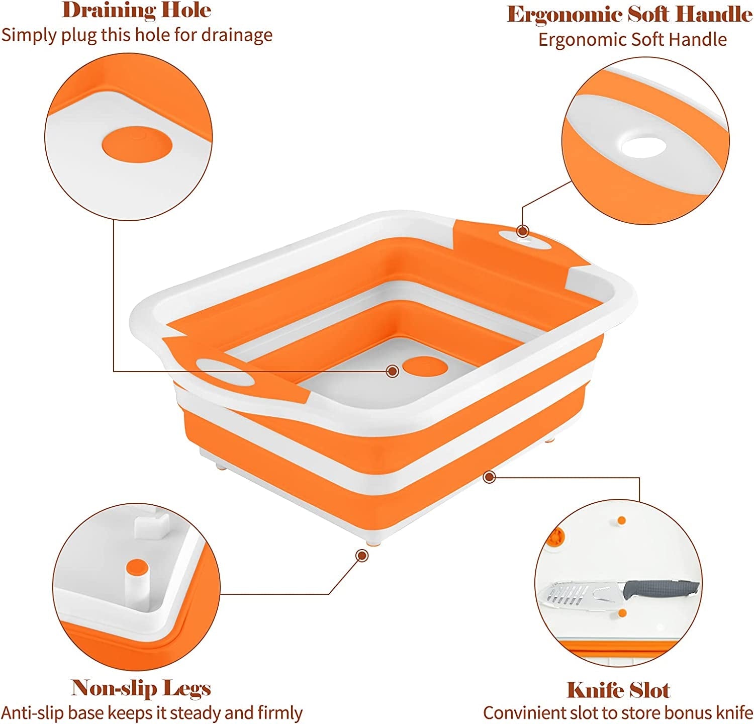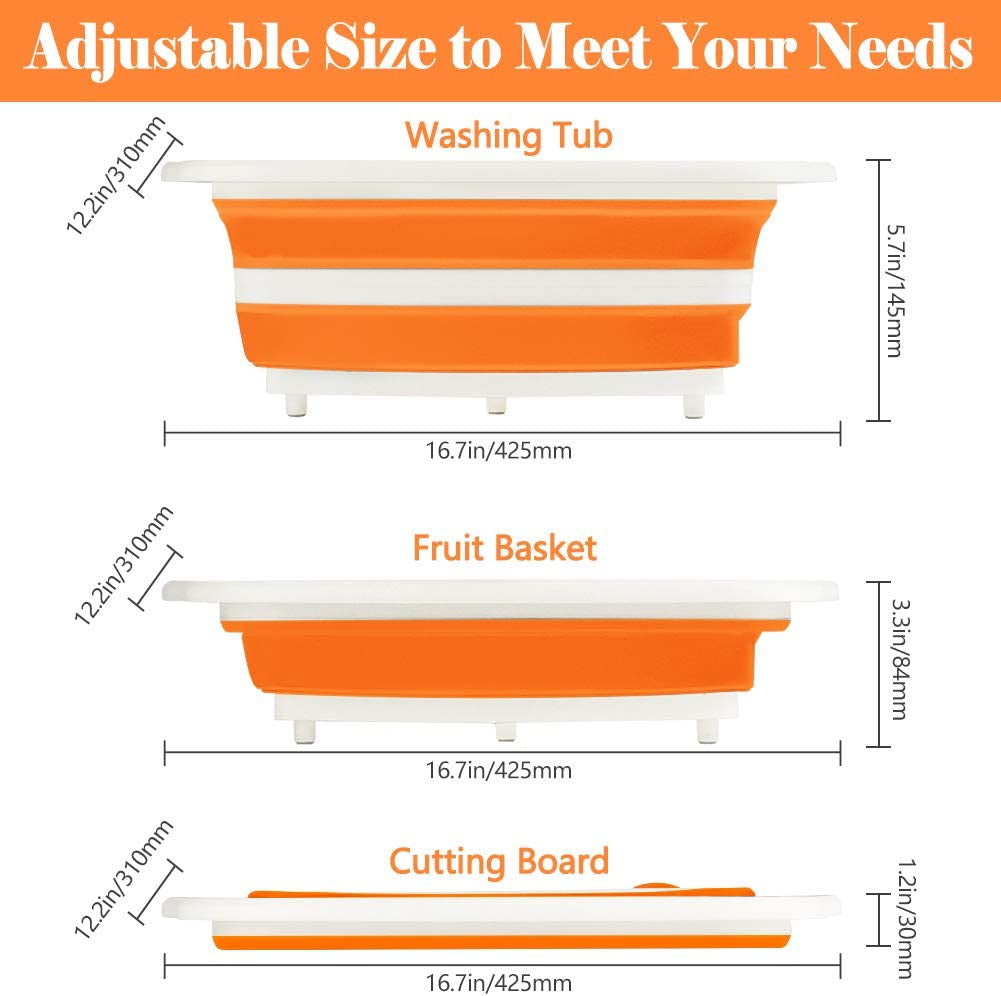 - ✔ Must-Have for Home and Outdoor: this useful kitchen gadget bring much convenience for kitchen stuff. The portable size is also handy for camping. hiking. fishing. beach. RV. garden. picnics. BBQ. Storage basket or a utensil works perfectly for icing beverages. foldable dish tub for washing. collapsible chopping board for cutting. chopping and slicing.