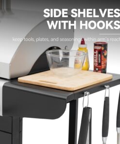 - Extra Prep Space: Two side shelves keep your grill tools. plates. and seasonings within arm’s reach. offering extra prep space. 3 hooks are integrated on both sides for hanging grill accessories.