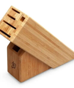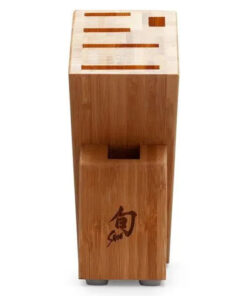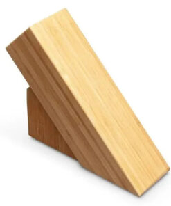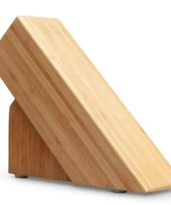 The perfect knife block for when counter space is tight. The block features slots for two larger knives. two medium or small knives. a honing steel. and a pair of kitchen shears. Made of durable bamboo. this block is easy to care for and will wear well.