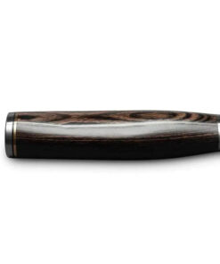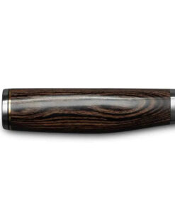 The Shun Premier Santoku Knife features a contoured. walnut-colored PakkaWood handle that provides a comfortable and secure grip. even during extended use. Its elegant design and ergonomic shape make it a pleasure to use in the kitchen.