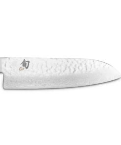 The 7-inch blade of the Shun Premier Santoku Knife features Shun’s signature Damascus-clad construction. which consists of 34 layers of stainless steel per side for exceptional strength. durability. and corrosion resistance. The blade is hand-hammered (tsuchime) to create a beautiful and unique finish that helps prevent food from sticking while slicing or chopping.