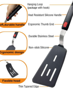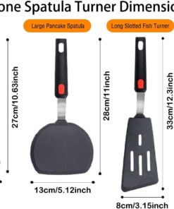 - 【Ergonomic Design – Silicone Slotted Turner Spatula Set with Anti-Slip Handle】Ergonomic design and comfortable anti-slip handle with hole for easy hanging. Ergonomic arc handle design. for more fit to the palm. both anti-slip and heat resistant design.