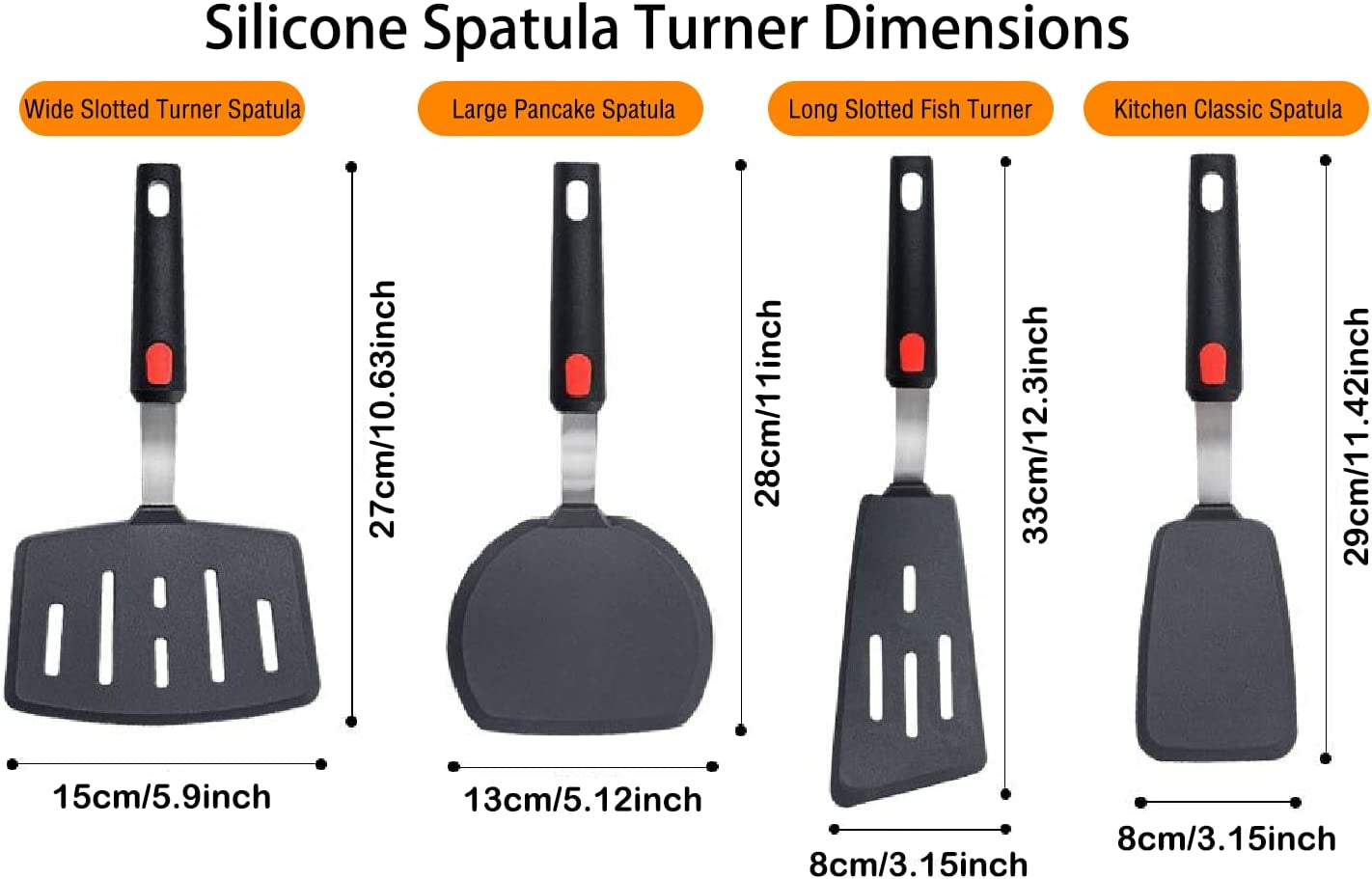 - 【4-piece Silicone Spatula Turner Set for Nonstick Cookware】This cooking spatula set include long slotted turner spatula. wide slotted turner spatula. large pancake spatula and long slotted fish turner. Thin. flexible silicone head with an angled edge and the extra thin edges allow the spatulas to glide easily beneath food for turning. lifting and flipping eggs. pancakes. burgers. fillets. Comes in different shapes to meet your different needs.