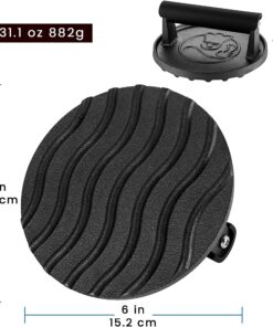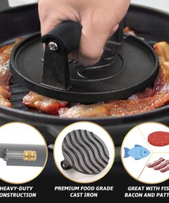 - EASY TO CLEAN & USE – Premium food grade meat smasher is oh so easy to clean! Just rinse under running water and wipe dry. Perfect bacon press for griddle that can help you for faster cooking and crispy finish. It also prevents the edges of your bacon and ham from curling.For best performance and durability. please season with oil spray.