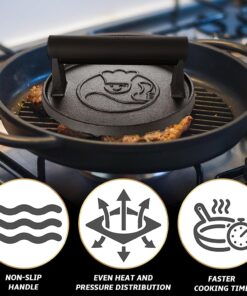- UNCONDITIONAL 5-YEAR WARRANTY – This cast iron burger press comes with an unconditional 5 year warranty. Why? Because this cast iron cookware is built to last. We use only the highest grade material and innovative design to ensure that it will last a lifetime!