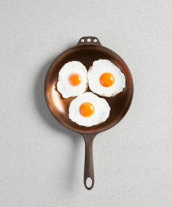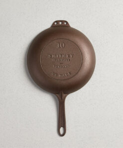 The No. 10 Chef Skillet is expertly designed to enhance movement in your cooking. With a larger surface area than the 8 Chef Skillet. it allows you to sauté extra vegetables and flip even bigger omelettes with ease. Like all Smithey skillets. it features our signature polished finish. which. when seasoned. becomes naturally non-stick and easy to clean. The skillet is pre-seasoned and made in the USA. providing an extended chef handle for added comfort during cooking. Its curved interior facilitates smooth movement. and convenient holes on both sides allow for easy hanging and storage.
