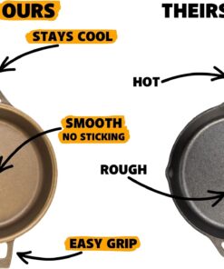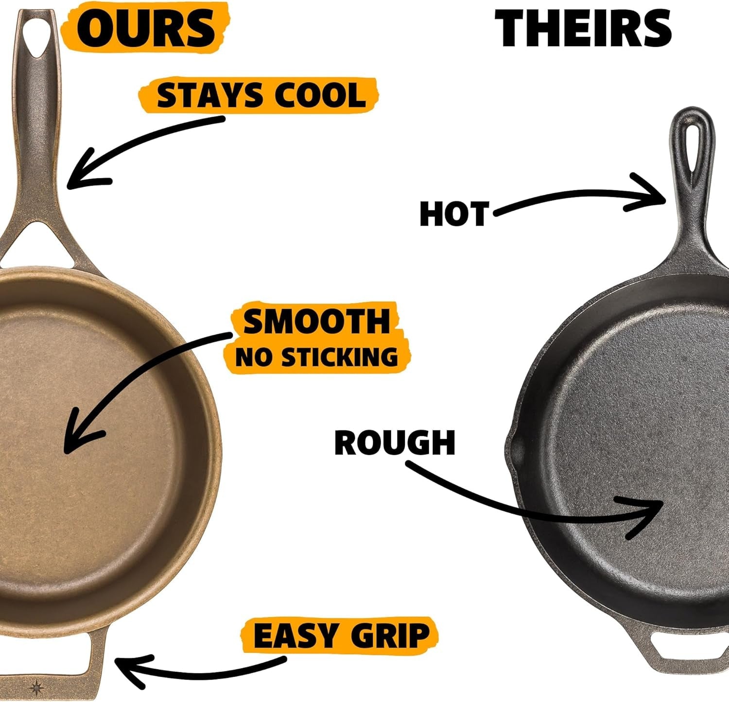 - MODERN DESIGN: Discover the modern innovation of our cast iron skillet. This medium-sized skillet offers exceptional heat retention. lighter than the traditional cast iron and easy handling. Featuring our stay-cool handle. it ensures your comfort and safety with its extended cooling properties.