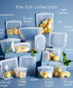 - CONTAINS: 4 Stasher Reusable Silicone Bags in the color Rainbow. Includes 1 Sandwich (28 Fl Oz). 1 Snack (12 Fl Oz). 1 Half Gallon (64 Fl Oz). and 1 Stand-up Mid (56 Fl Oz) Bag.