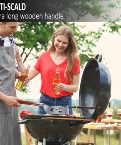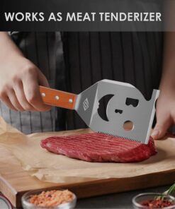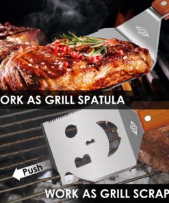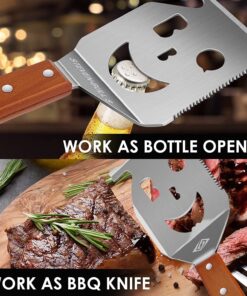 - HEAVY DUTY BARBECUE UTENSILS. Multi-function Grill tool .extra-thick and strong grill spatula. never bend. no wobble or fall off. large enough. smooth surface. easy to use and clean. hand wash required. Extra-long wooden handle. no more singed arm hair. anti-scalding