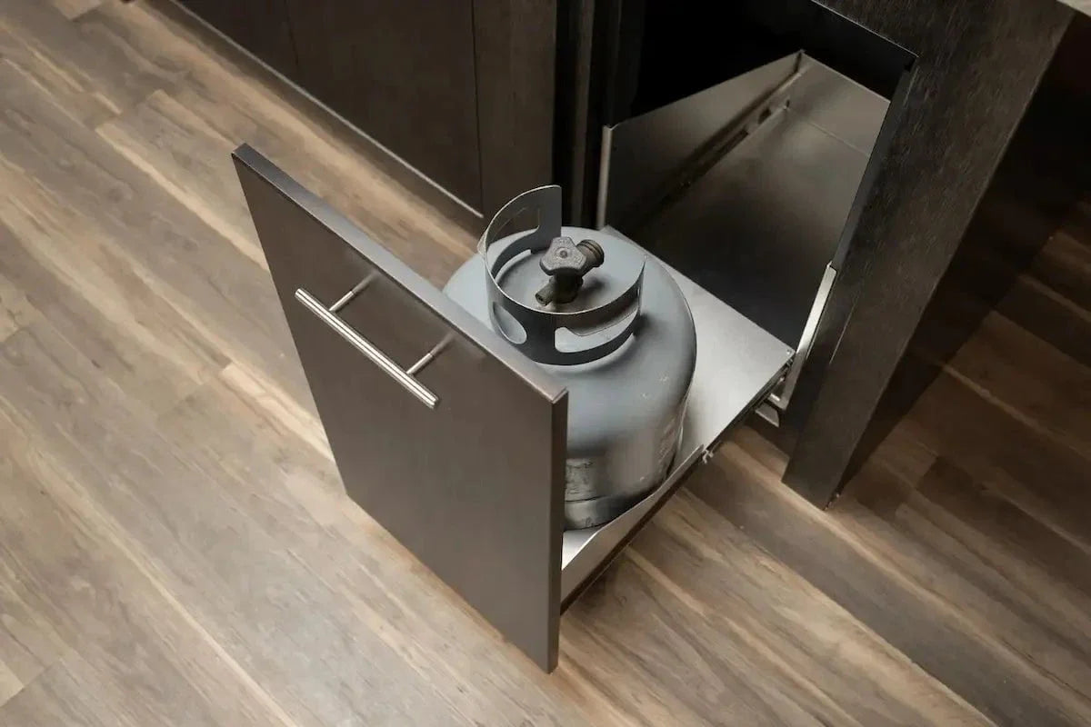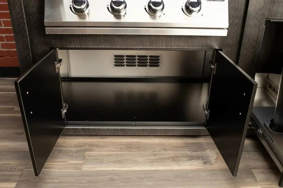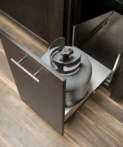 Designed for both style and function. this grill island features a spacious 29 x 30 countertop on the right side. perfect for meal prep or serving. Underneath. double doors with soft-close hinges open to reveal a generous 24 deep x 48 wide storage area. providing ample space for all your grilling essentials. A convenient pullout drawer with soft-close technology accommodates either a 20-pound LP tank or a trash can. keeping everything within easy reach and neatly organized.