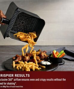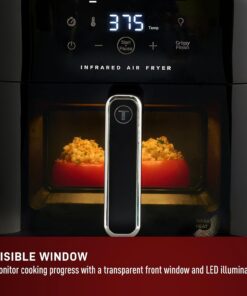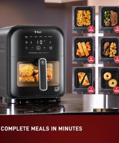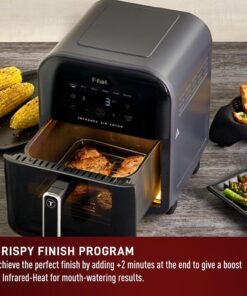 Elevate your cooking with the t-fal infrared compact air fryer’s. designed with cutting-edge infrared technology. This air fryer mimics the nostalgic flavors of open-fire cooking while providing juicier and more flavorful food. With a carbon fiber heating element reaching up to 750f in just 45 seconds. the t-fal air fryer offers instant heat-up without the need for preheating. Enjoy versatile cooking with 7 programs including air fry. broil. roast. bake. reheat. toast. and the exclusive crispy finish function that adds a delectable crunch to your dishes. The airfryer’s no-shake technology. utilizing t-fal’s innovative infra-heat air-flow design. provides even cooking throughout. eliminating the need for basket shaking mid-cook. Monitor meals through the always on lighted window for great results. With a 6qt air fryer capacity. you can easily prepare a full meal or roast a whole 3 lb chicken. making it ideal for both families and entertaining. The ptfe nonstick basket makes for easy food release and cleaning. while the sleek black design complements any modern kitchen. Operating at 1550w. this big air fryer efficiently cooks with minimal oil. promoting healthier eating by reducing calorie and fat intake without sacrificing taste.