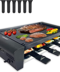 TAMARIT Raclette Table Grill for 8. 2 in 1 Raclette Grill Small Swiss Style Raclette Pfas-No Nonstick Reversible Grill/Griddle Plate Adjustable Temperature Control 1300 W. 8 Raclette Cheese Pans Black