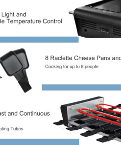 - Individual Non-Stick Raclette Pans: Each flat raclette grill comes equipped with 8 individual raclette pans. suitable for family gatherings or social occasions. Sitting around the indoor countertop raclette grill.guests can personalize their cooking experience. preparing cheese. sauces. or desserts to their liking. Cleanup is effortless with the included 8 pcs plastic spatulas. ideal for removing melted cheese with ease