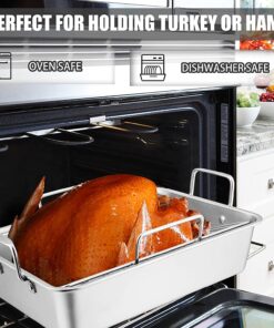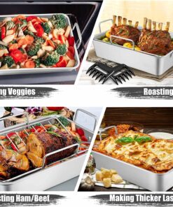 - OVEN & DISHWASHER SAFE – Stainless steel roasting pan can be run in the oven and dishwasher. Smooth finish surface helps release nicely. Cleaning is a breeze. Pan and racks and silicone brush are dishwasher safe to save your labor and hassle free. Meat claws are hand wash only