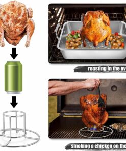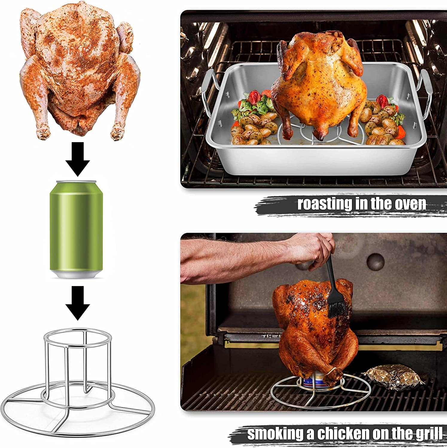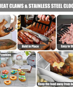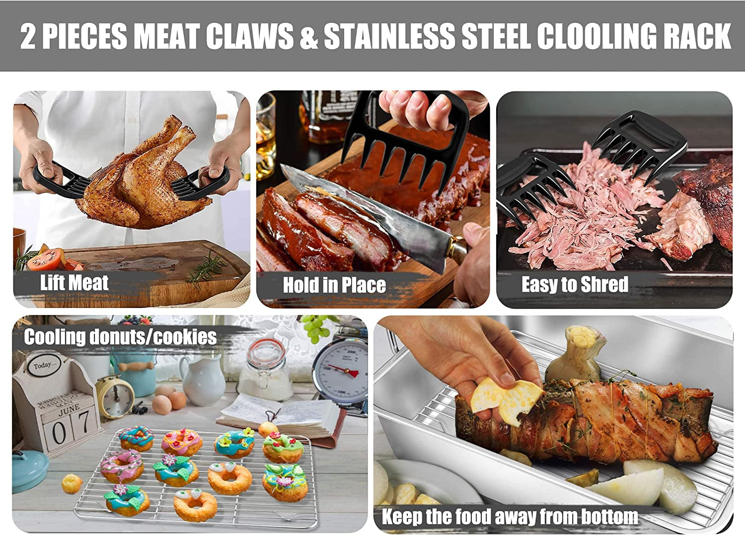 - MULTIPURPOSE(7 PIECES) – Roasting pan with rack perfect for roasting turkey / ham / rib for Thanksgiving and Christmas. and baking deeper lasagna or casseroles. Chicken rack for keeping the chicken erect. Cooling rack fits inside to keep the food away from bottom or cooling cookies. Meat claws easy to shred the meat or hold the food in place. Silicone brush great for basting sauce when barbecue. Great addition to your kitchen!