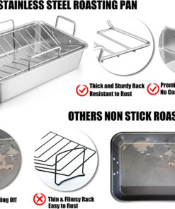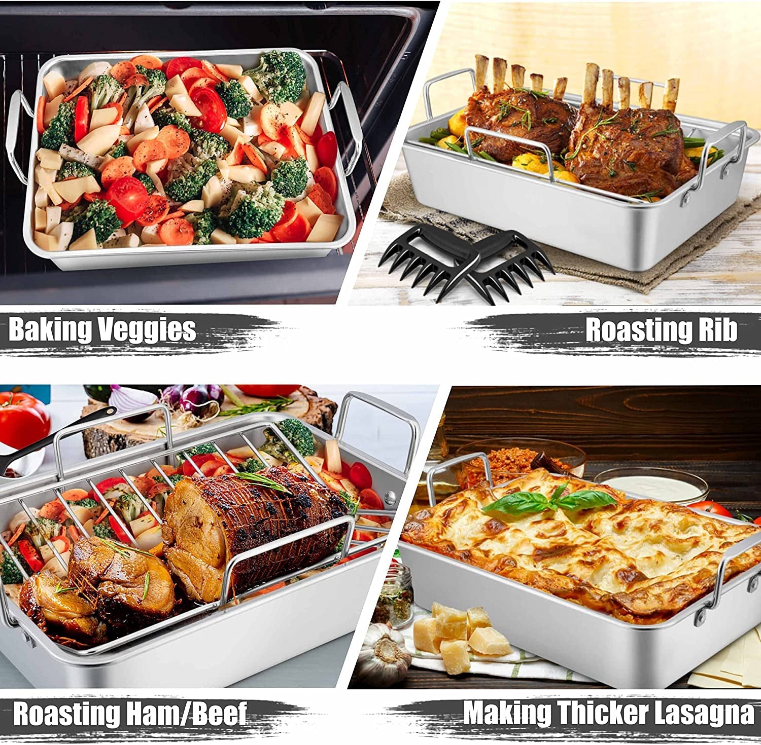 - EXQUISITE CRAFT – Large roasting pan features heavy duty and solid construction. Durable for long-last serving time. Wider and vertical handles firmly riveted to the pan. Effortlessly remove the pan from oven. Tall v rack with thick and sturdy design. Not easy to deform. Keeps the meat up from the juice and leaves more room to add veggies. The sharp edges of meat claws that strongly grips the meat and tears it apart easily