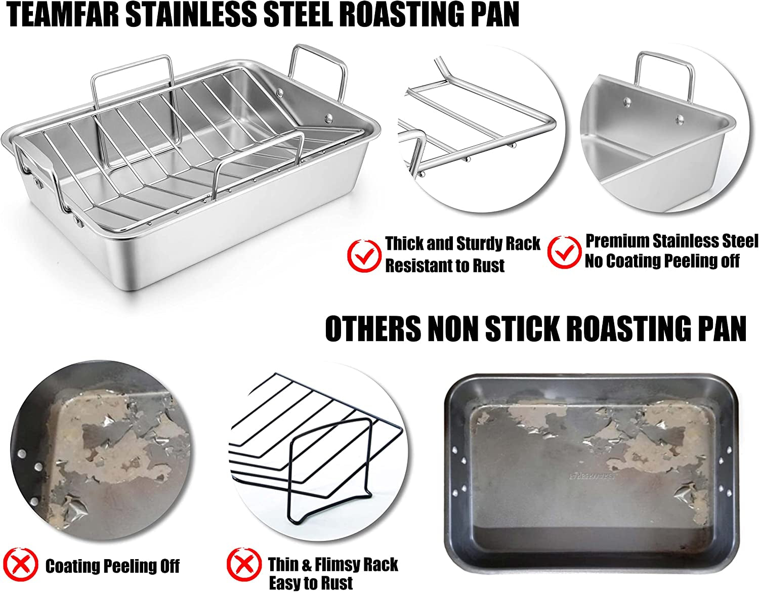 - NO COATING PEELING OFF – TeamFar roaster pan and v roasting rack and cooling rack are constructed with well made stainless steel. No worries about coating flaking off. A great substitution of stainless steel for nonstick roasting pan. Healthier for baking use