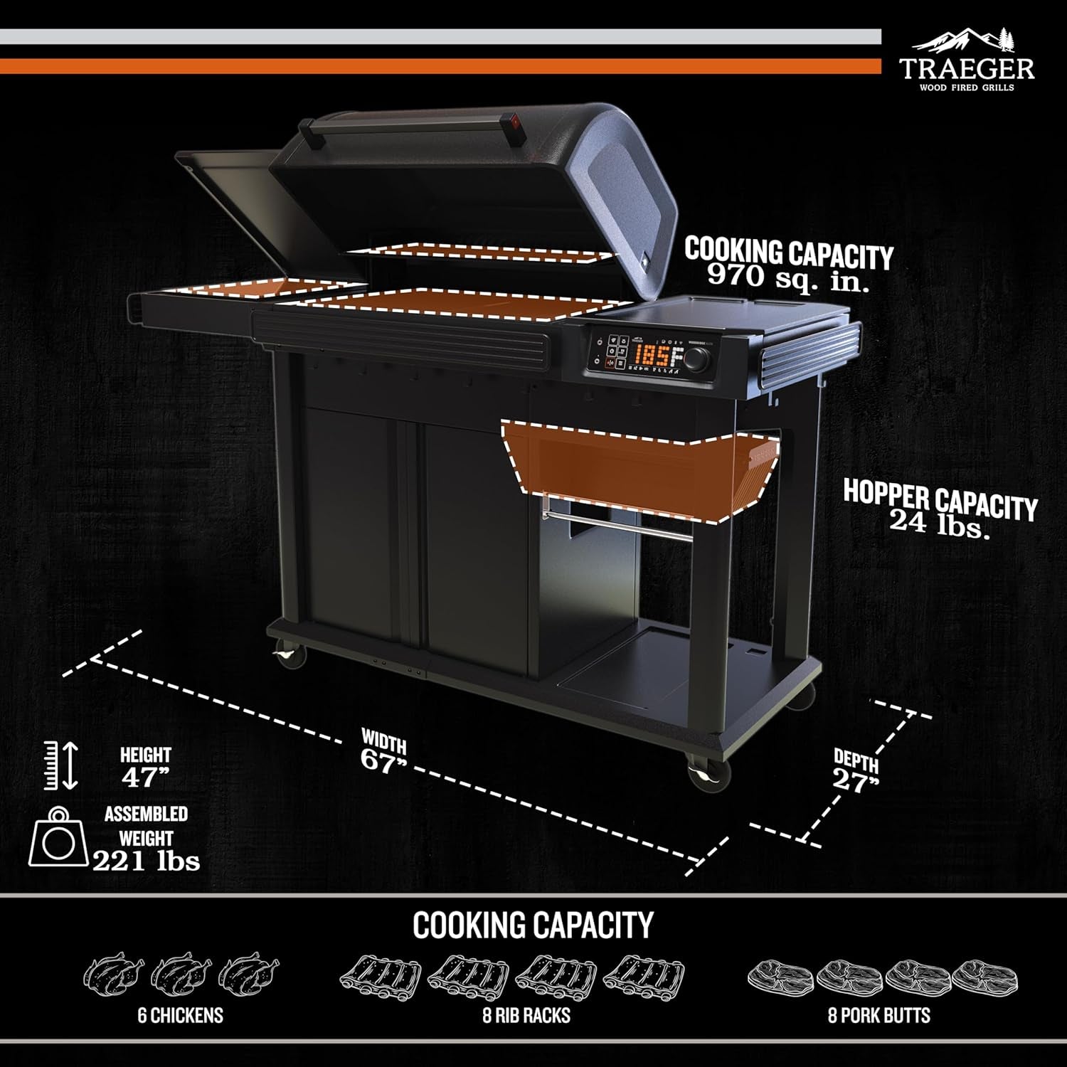 - Large Cooking Capacity: With 970 sq. in. of grilling space. this Traeger pellet smoker grill handles up to 7 chickens. 9 rib racks. or 7 pork butts. making it easy to serve meals for family dinners. sporting events. and celebrations.